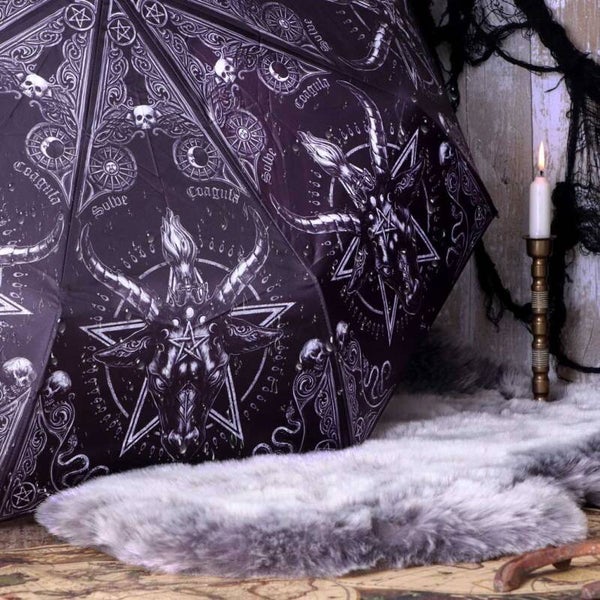 Baphomet ParapluGewicht (in doos):0,3 kgMateriaal: kunststof, metaal, 190T pongeeBaphomet geïnspireerd paraplu.Makkelijk mee te nemen en op te bergen.Krimpt tot 24 cm lang en 5 cm breed.Uitschuifbaar tot 55 cm lengte en 1 m spanwijdte.