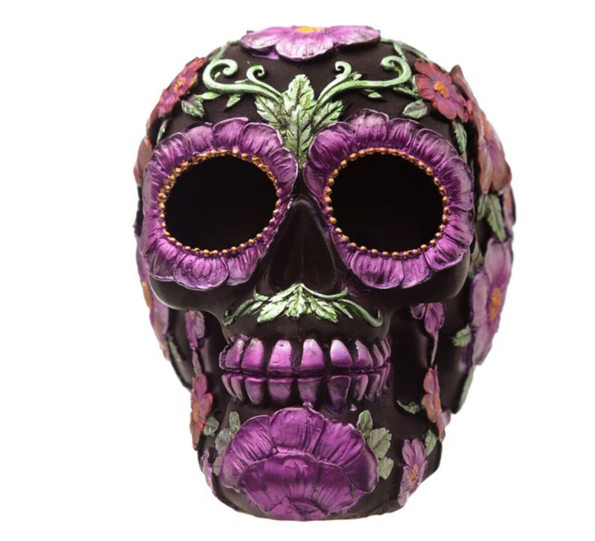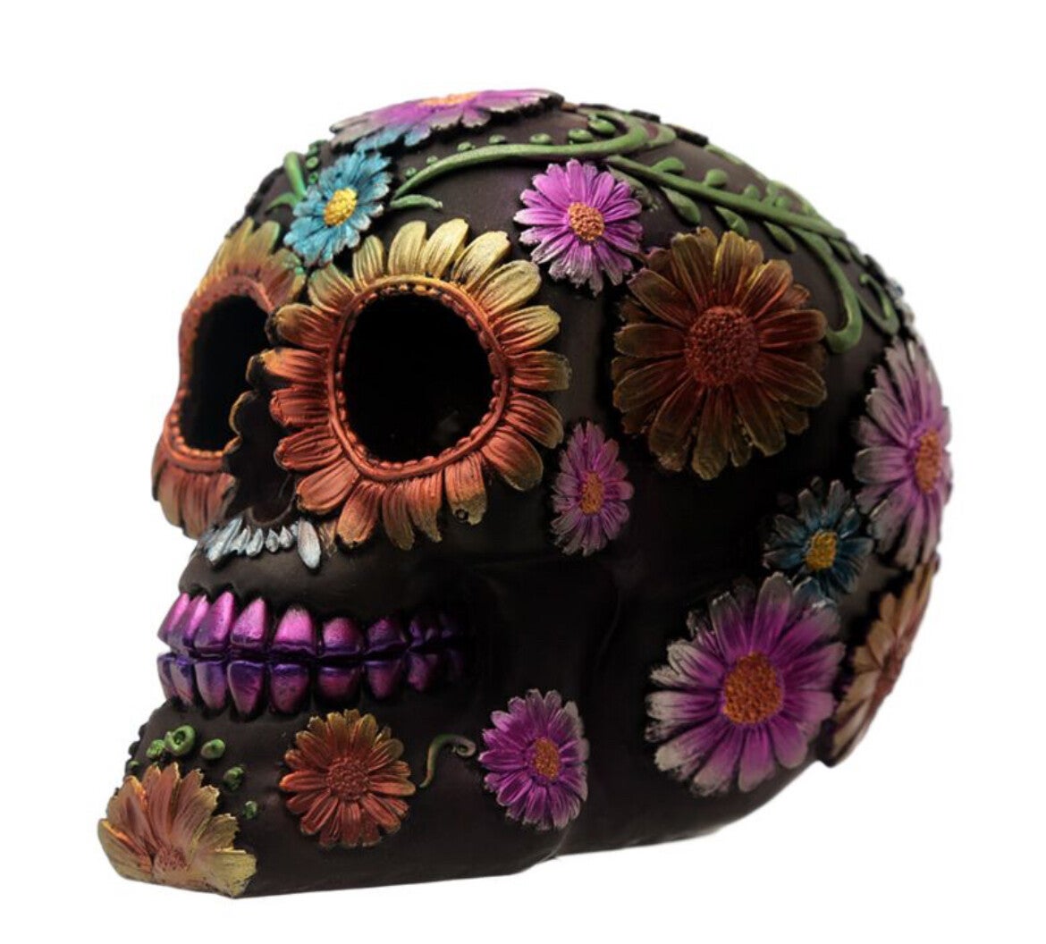 Mexicaans doodshoofd (Dia de los Muertos) woonaccessoire.Versierd met kleurrijke bloemen.