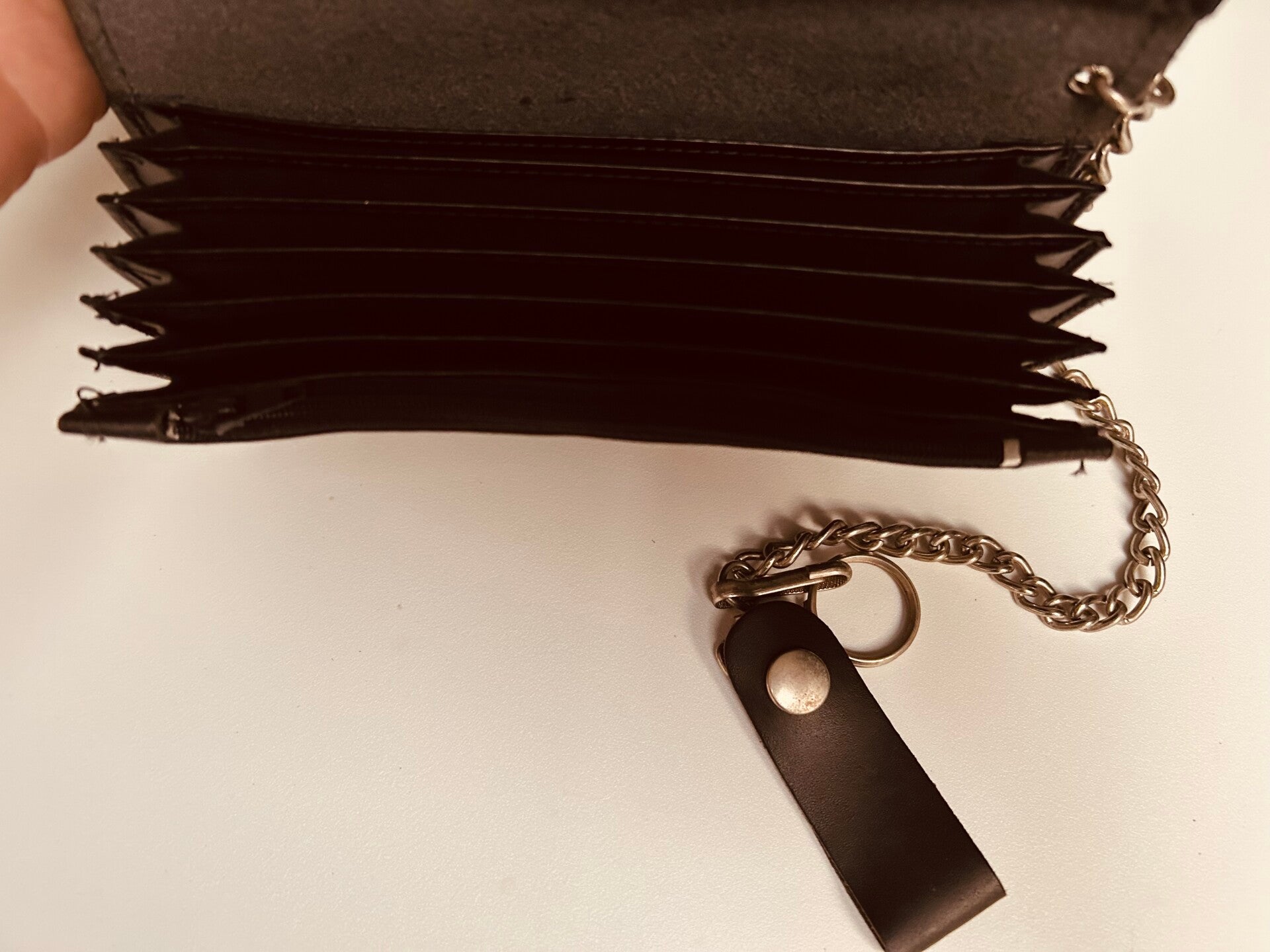 biker van portemonnee van leer met een afbeelding van een vliegende adelaar.De portemonnee heeft een afmeting van 16 x 9 cm en wordt geleverd met een afneembare ketting om aan de broek te bevestigen.Ideaal voor de stoere biker!